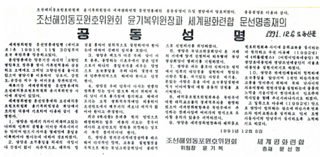 △A joint statement by Chairman Ki-Bok Yoon of the North Korean Institutions on Overseas Korean Affairs and Rev. Sun Myung Moon of the Federation for World Peace was announced in Pyongyang on December 5. On the next day, December 6, the joint statement was published in the Rodong Sinmun newspaper. – Rodong Sinmun, December 6, 1991